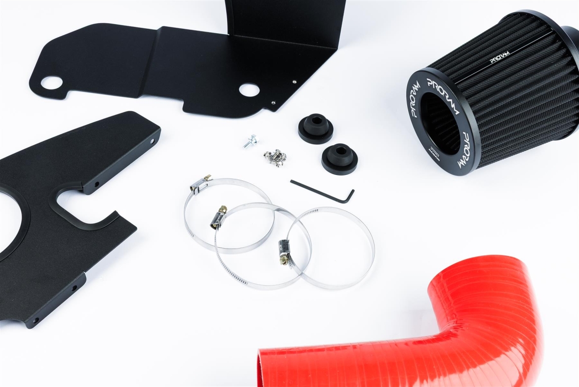The system includes a red multi-ply silicone inlet pipe, providing smooth unrestricted airflow and improved durability compared with the factory plastic intake hose while adding a distinctive performance look to the engine bay. A black powder-coated heat shield helps protect the intake from engine bay heat and maintains a clean OEM-style appearance.